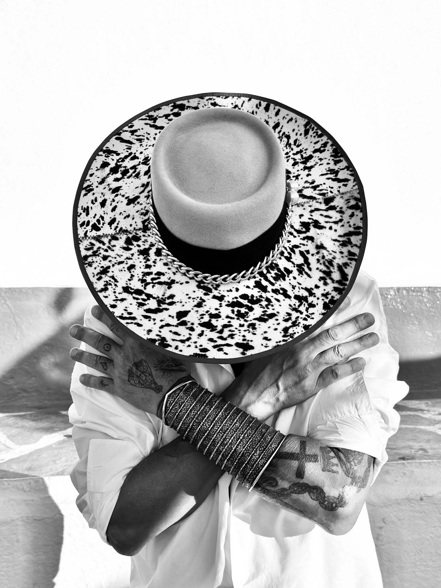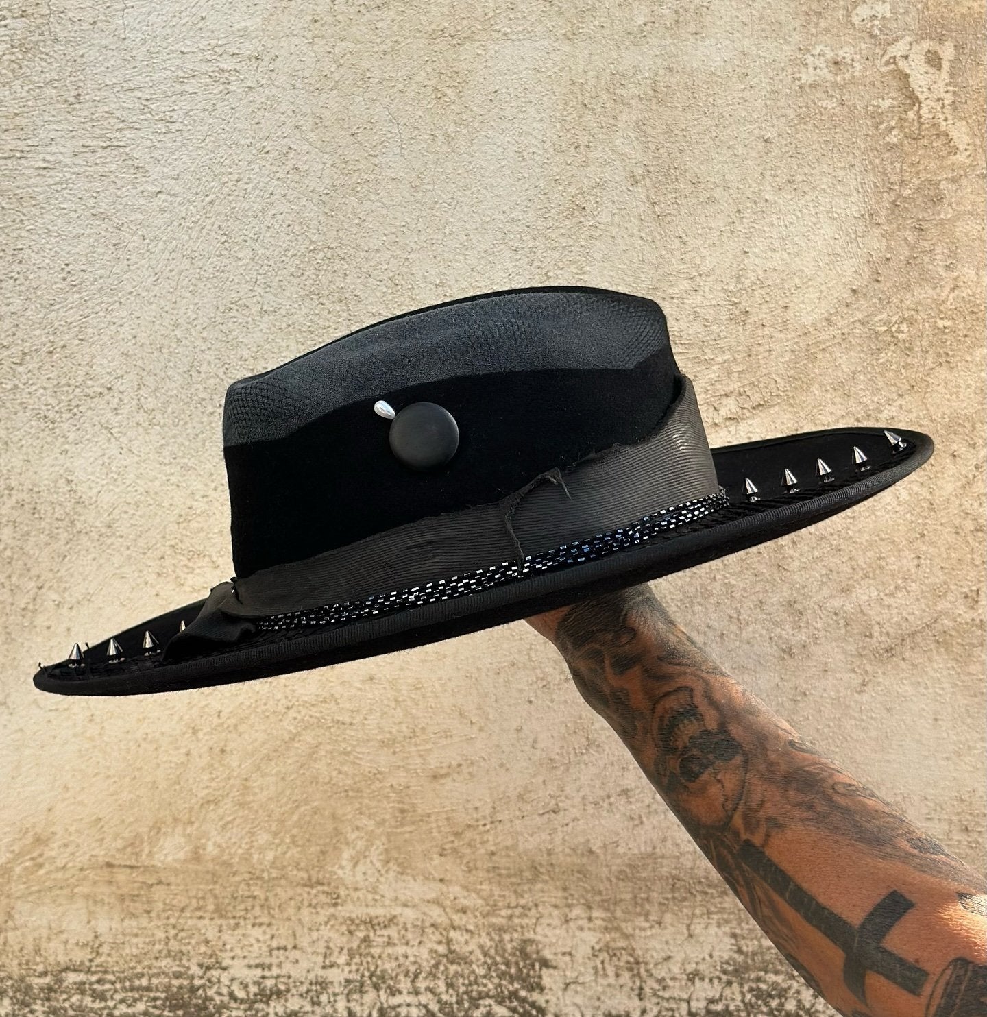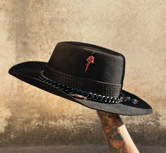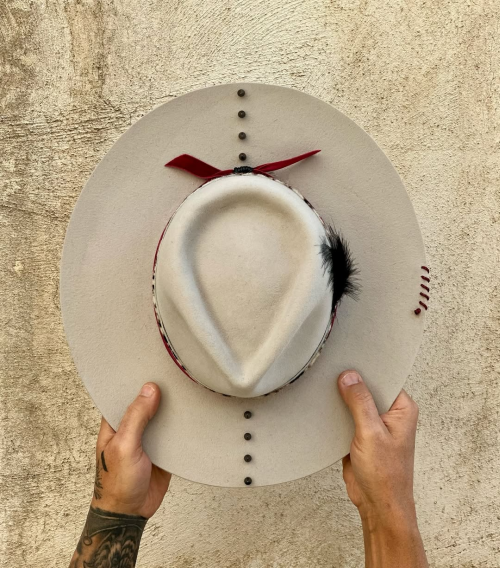 Each BlueBlood by Kos creation begins with the finest rabbit or beaver felts, hand-blocked and steamed into form. The crown and brim are shaped using traditional millinery tools, then refined through sanding, stiffening, and precise finishing. Every detail — from hand-sewn bands and bindings to painted, burned, and symbolic accents — is crafted by hand, ensuring no two hats are ever alike.