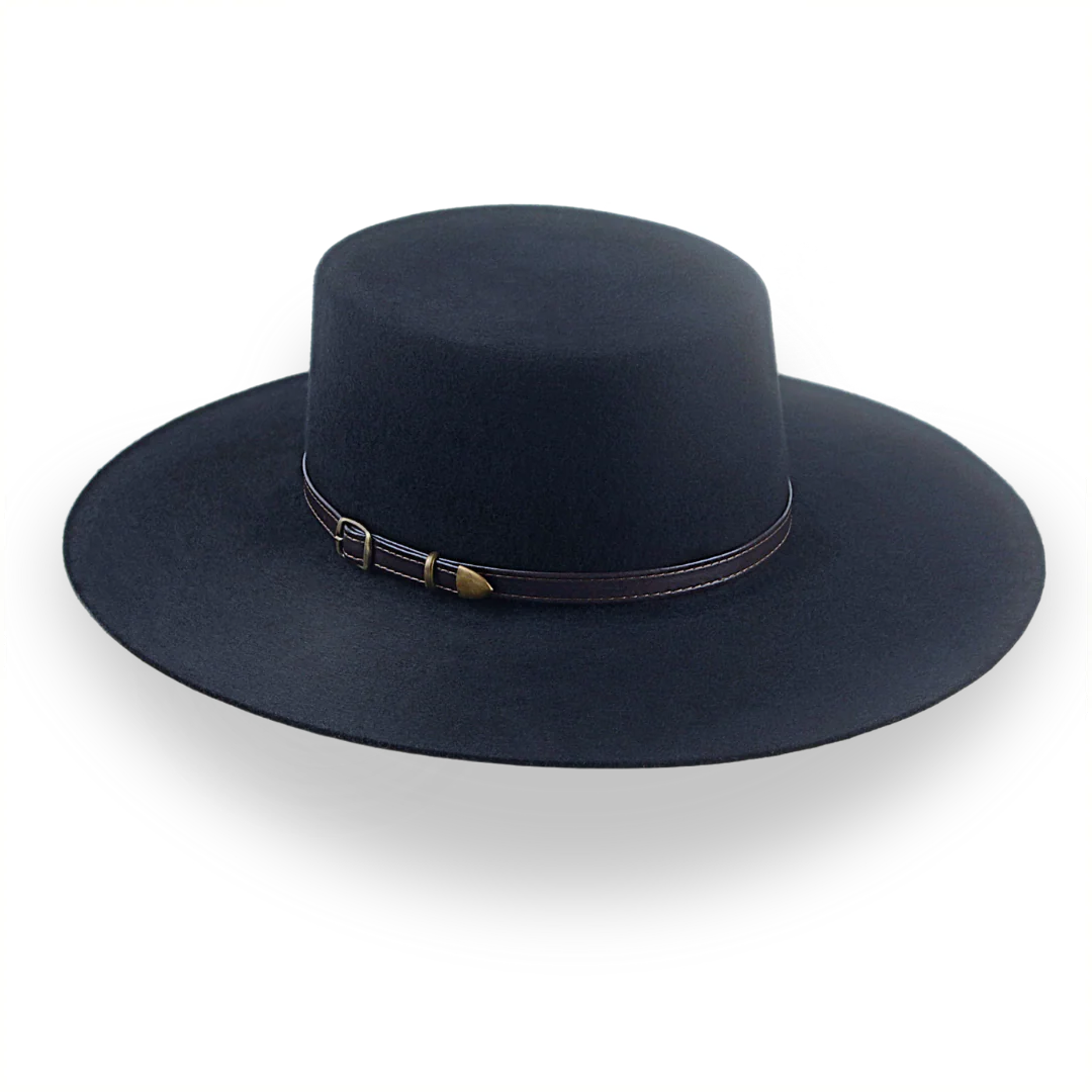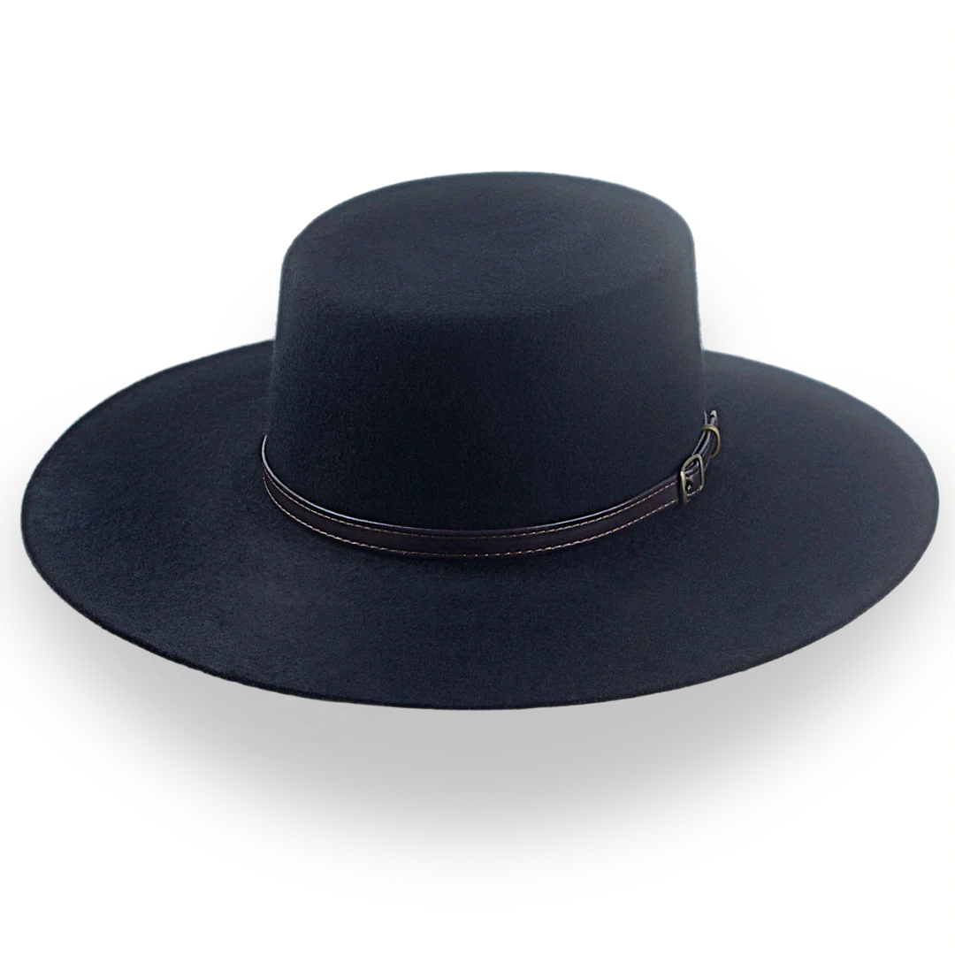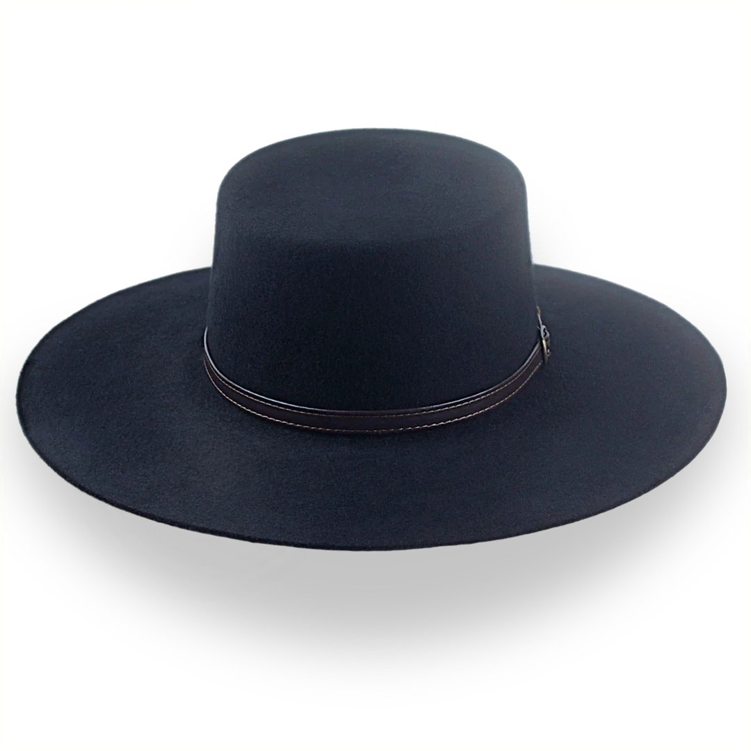 The Galloper is a flat crown wide brim bolero hat crafted from European wool felt, featuring a raw-edge flat brim and leather hat belt. Custom-made for a perfect fit, this hat combines bold style with timeless elegance.