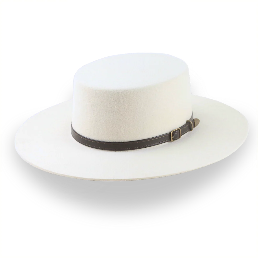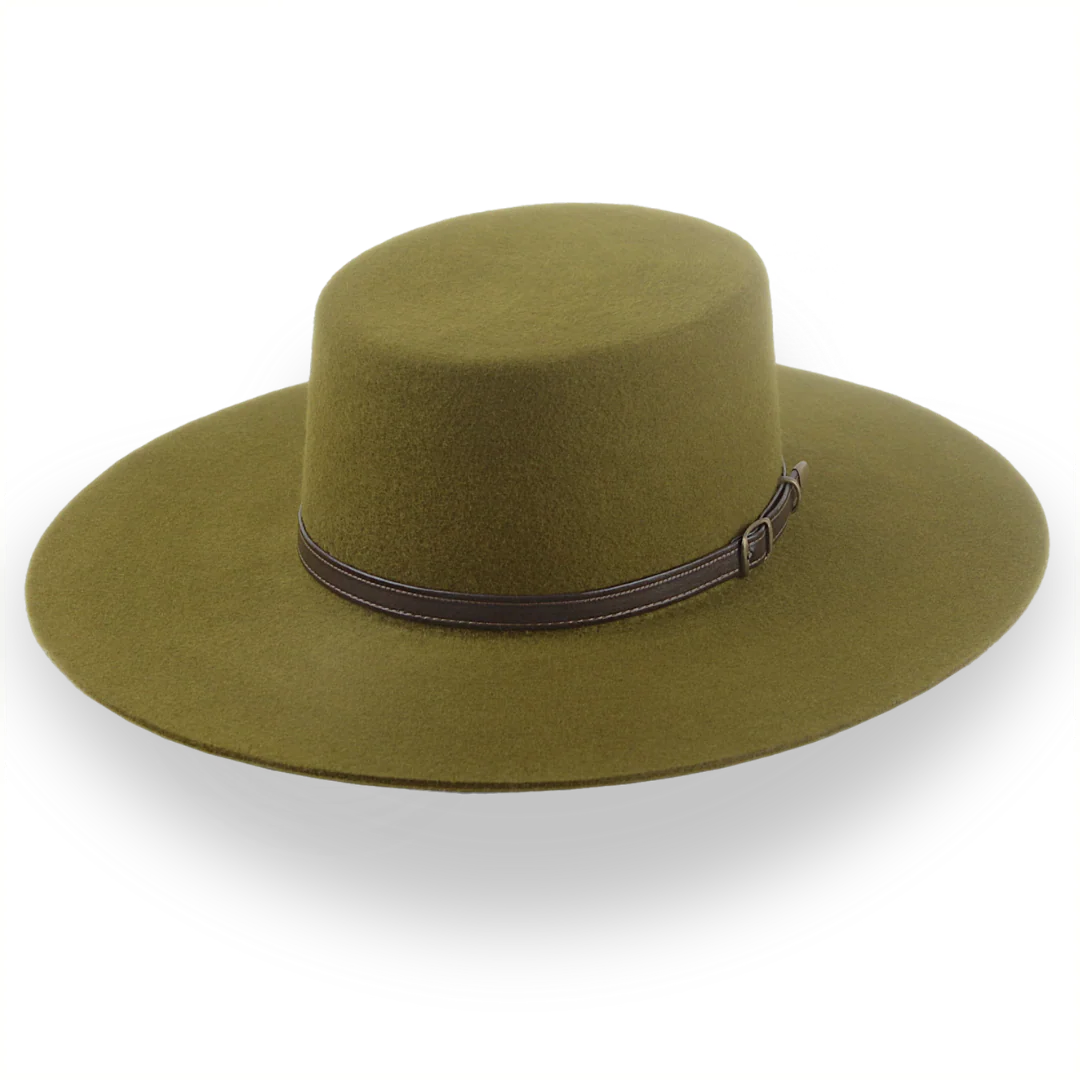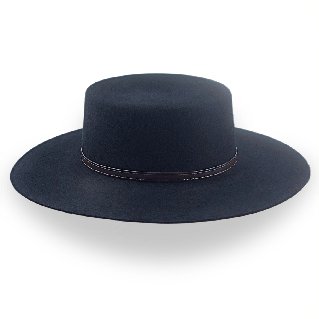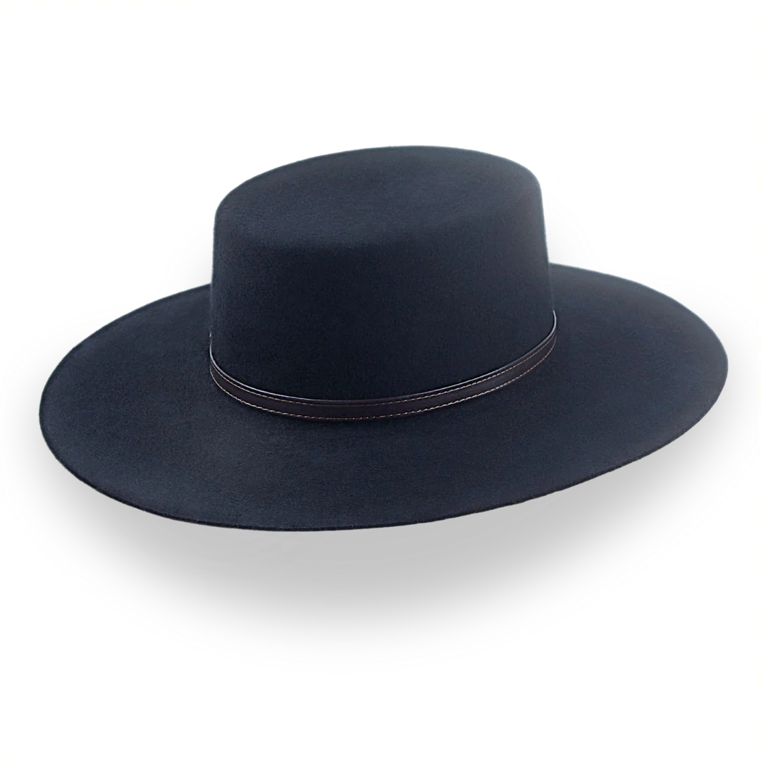 The Galloper is a flat crown wide brim bolero hat crafted from European wool felt, featuring a raw-edge flat brim and leather hat belt. Custom-made for a perfect fit, this hat combines bold style with timeless elegance.