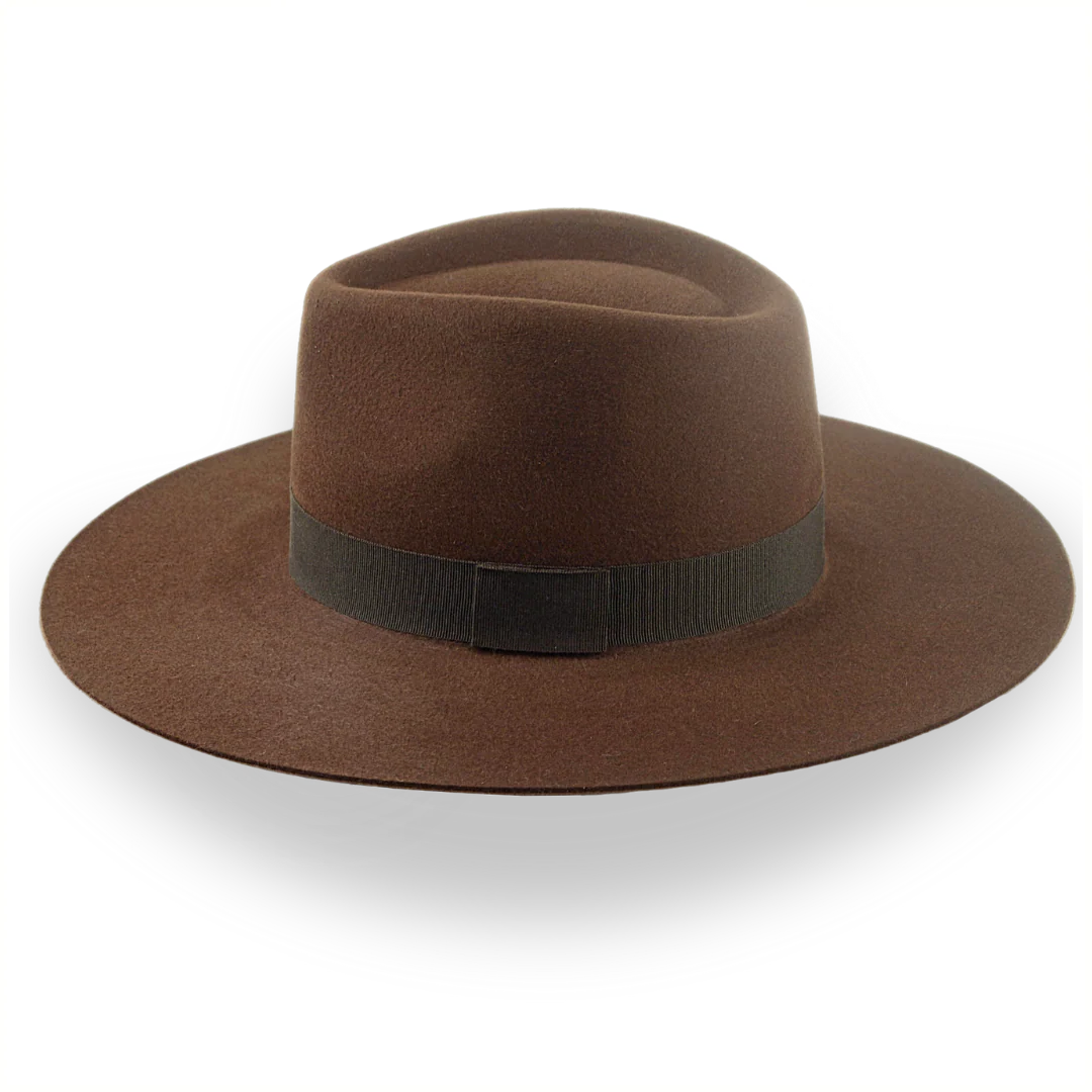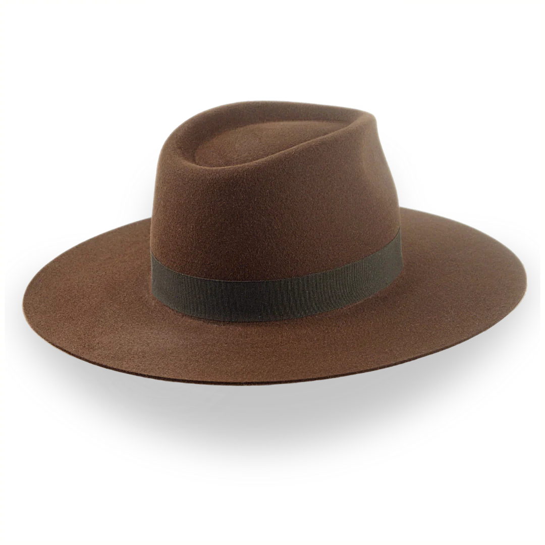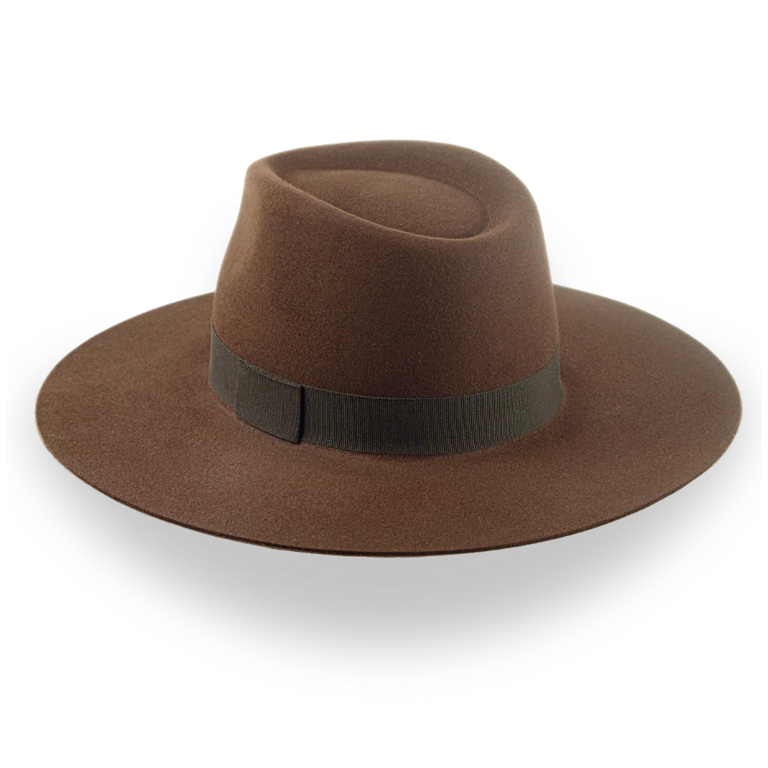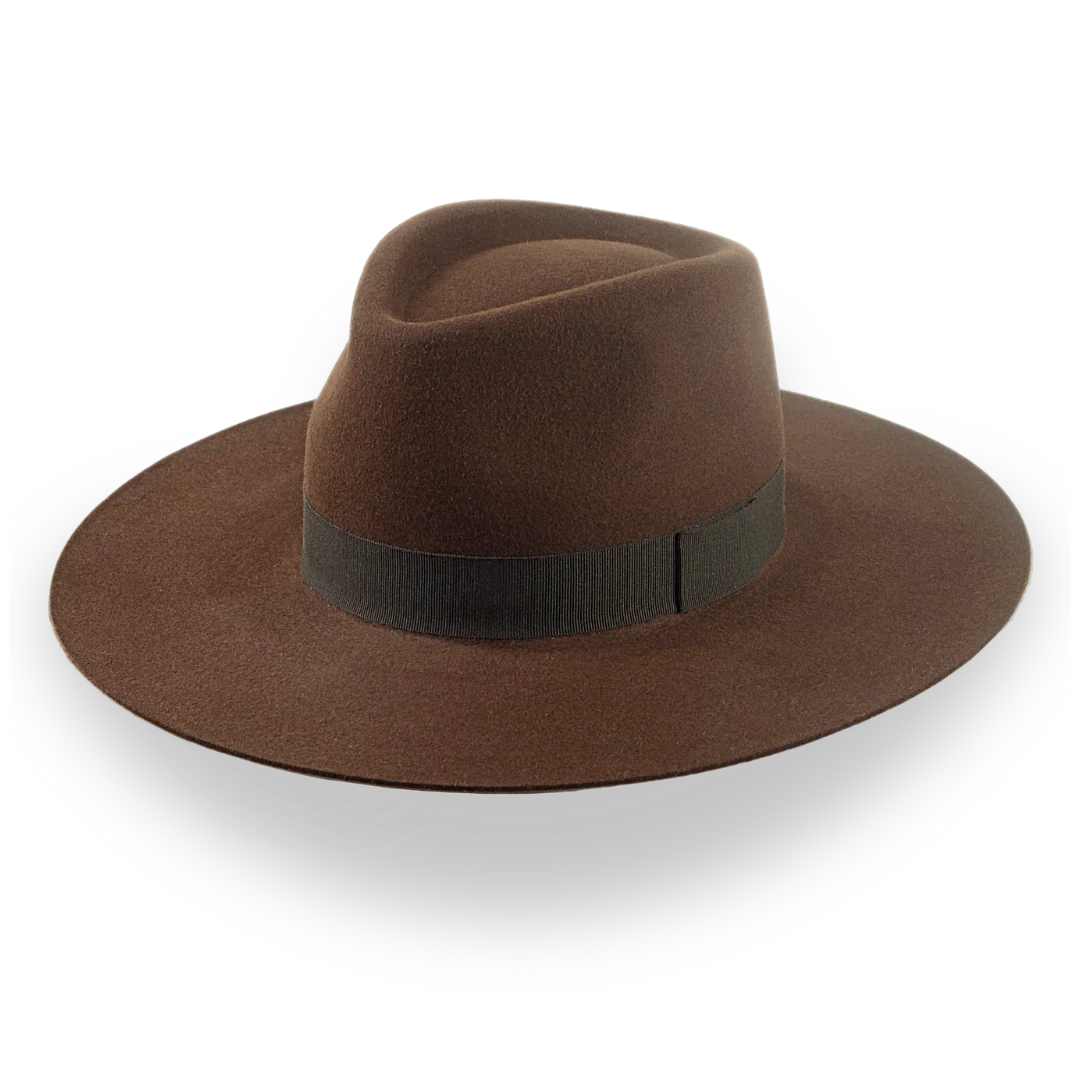 The Caravan, a brown wide brim rancher fedora, is handcrafted from durable rabbit fur felt with a 5 1/4" center-dent crown. Custom-made for a perfect fit, this hat blends rugged style with luxurious details.