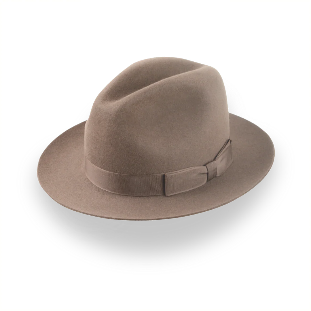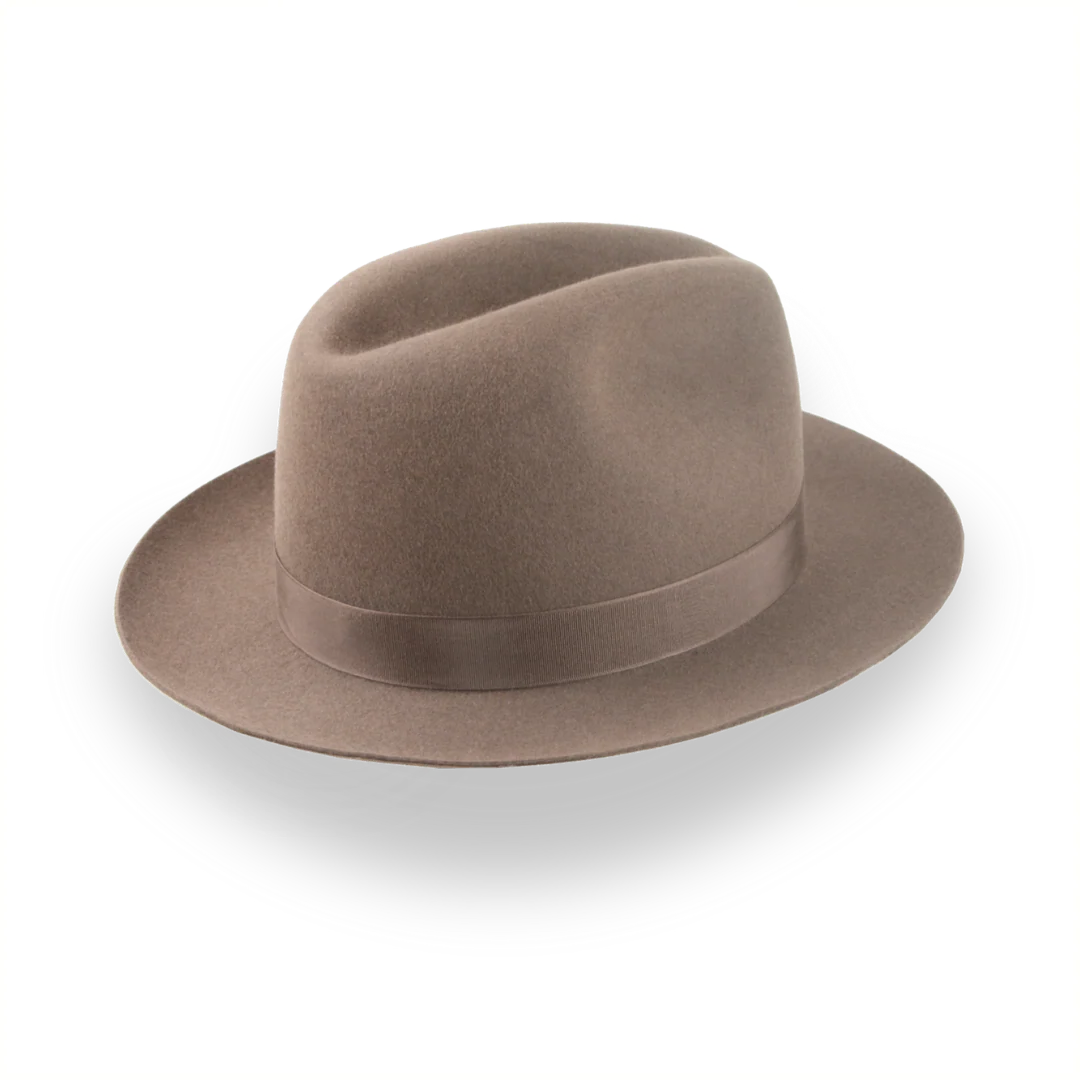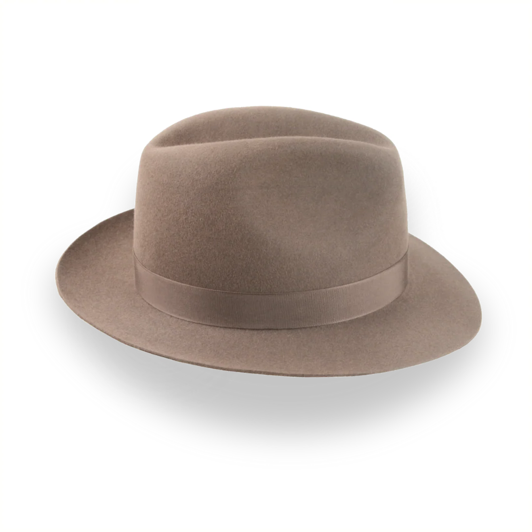 The Fortis, a taupe brown artisanal fedora, combines premium rabbit fur felt with a center-dent crown for a refined look. Custom-made for a perfect fit, this hat offers style and comfort for any occasion.