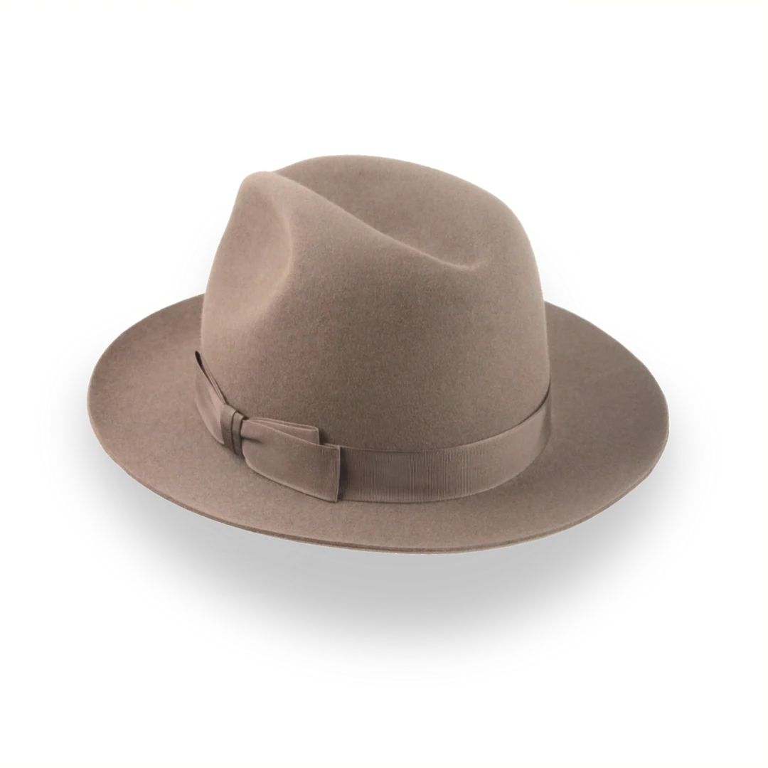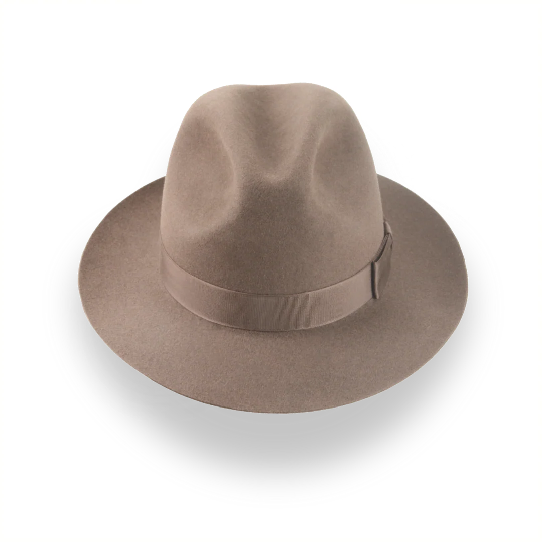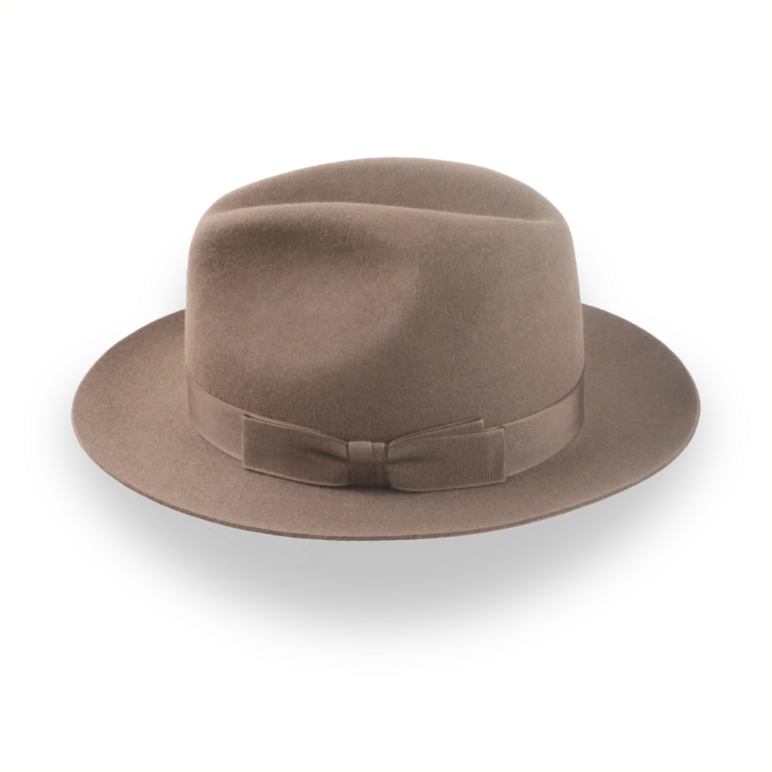 The Fortis, a taupe brown artisanal fedora, combines premium rabbit fur felt with a center-dent crown for a refined look. Custom-made for a perfect fit, this hat offers style and comfort for any occasion.