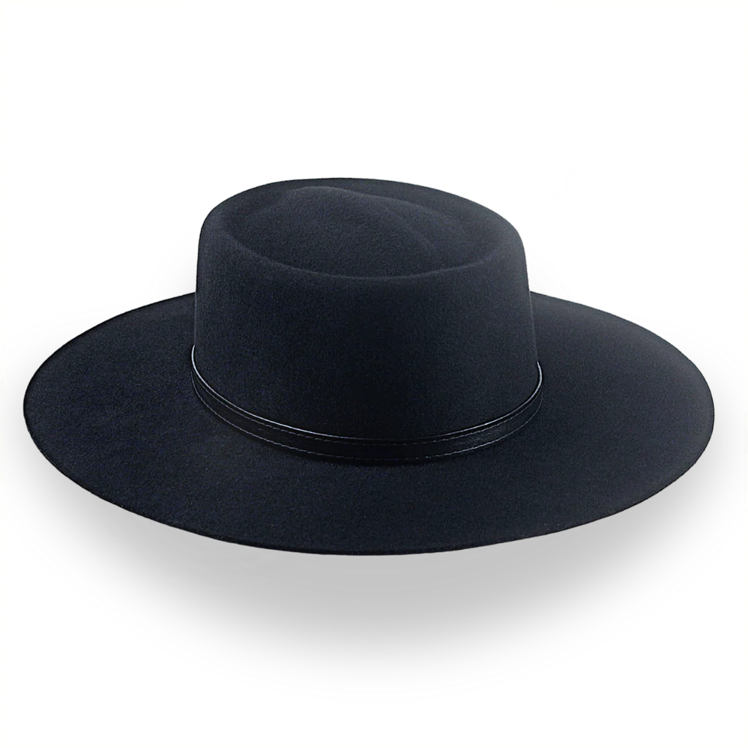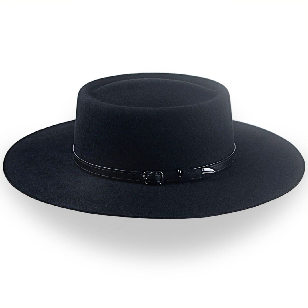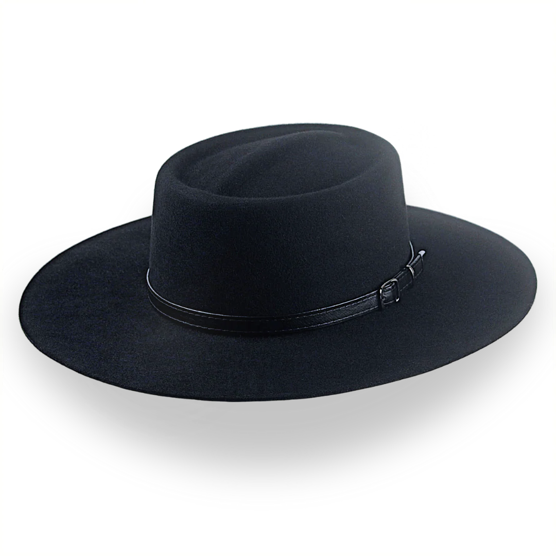 The Gambler is a black wide brim cowboy hat crafted from premium fur felt, offering a classic western design with a modern twist. Handcrafted for a custom fit, this hat is a bold expression of personal style and individuality.