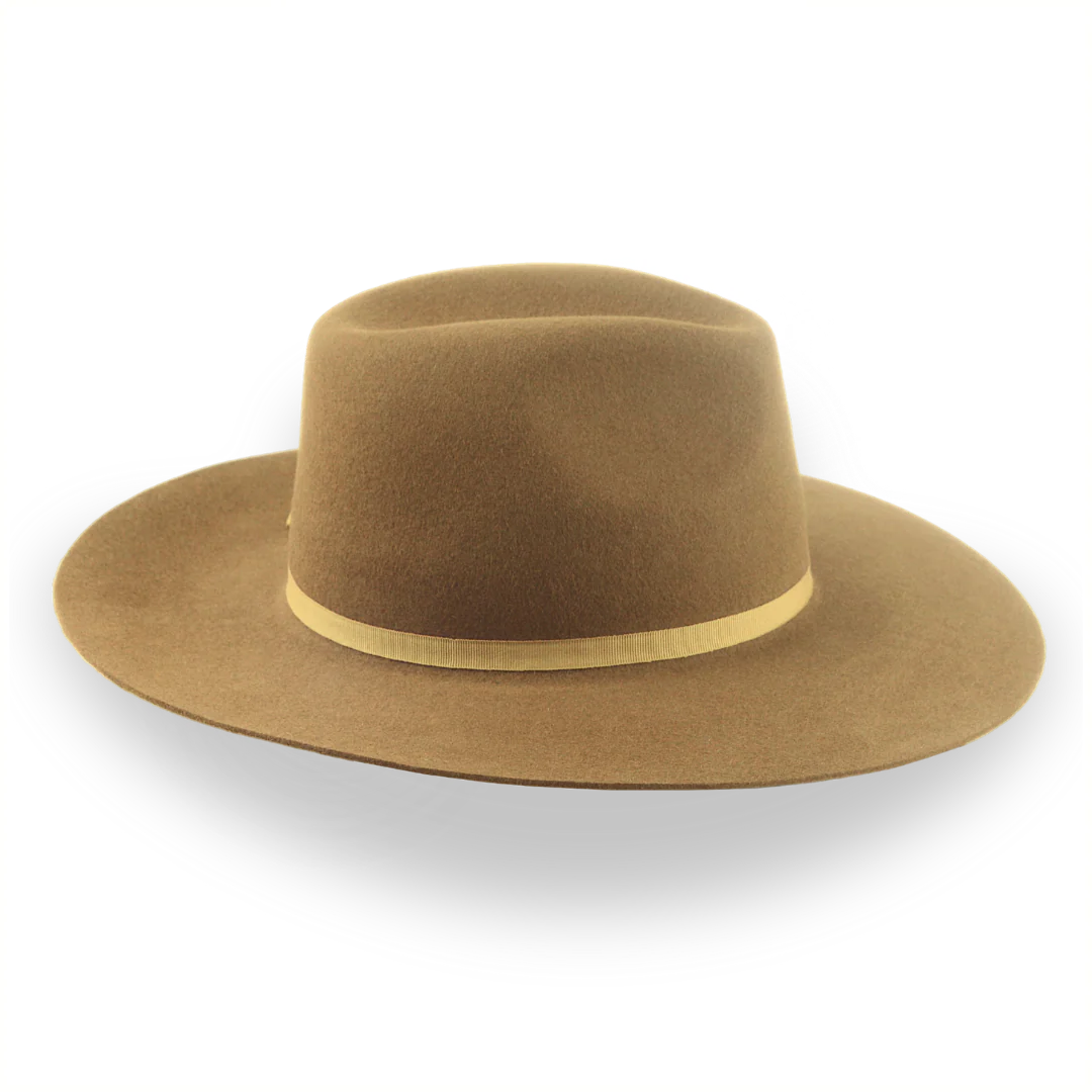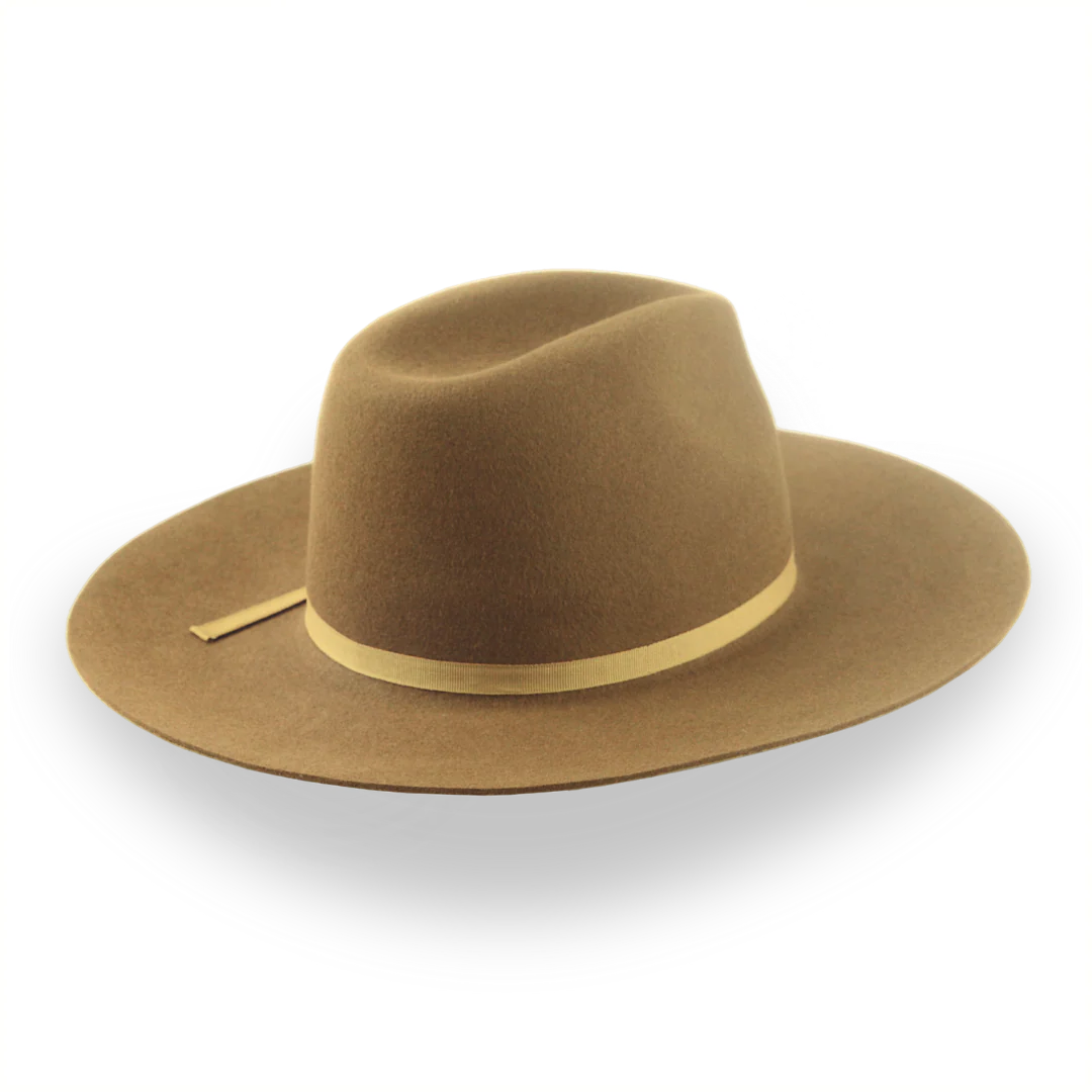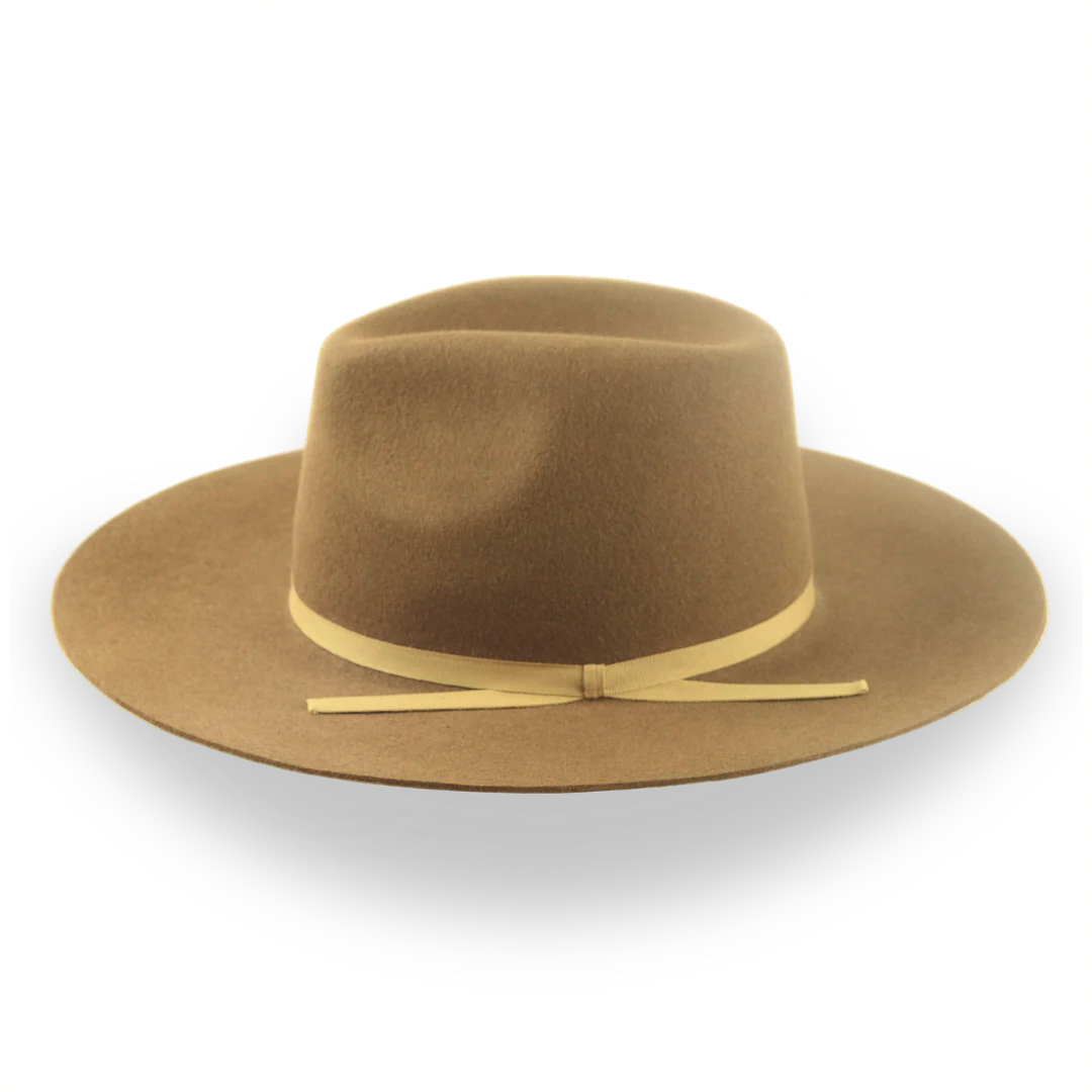 The Longsword is a brown flat bill Western fedora handcrafted from premium rabbit fur felt, featuring a wide flat brim and center-dent crown. Custom-made for a perfect fit, this hat offers rugged style with practical sun protection.