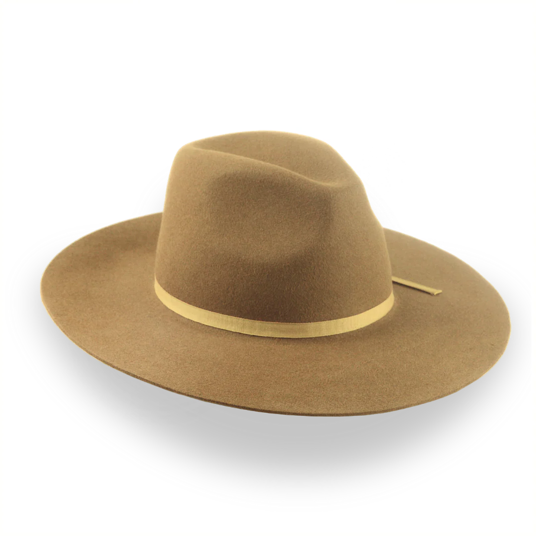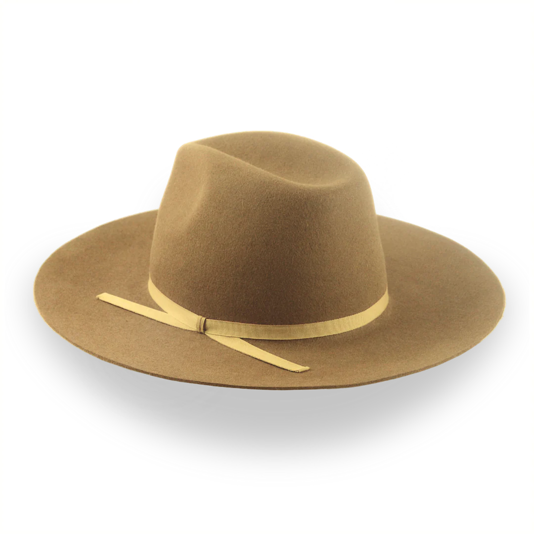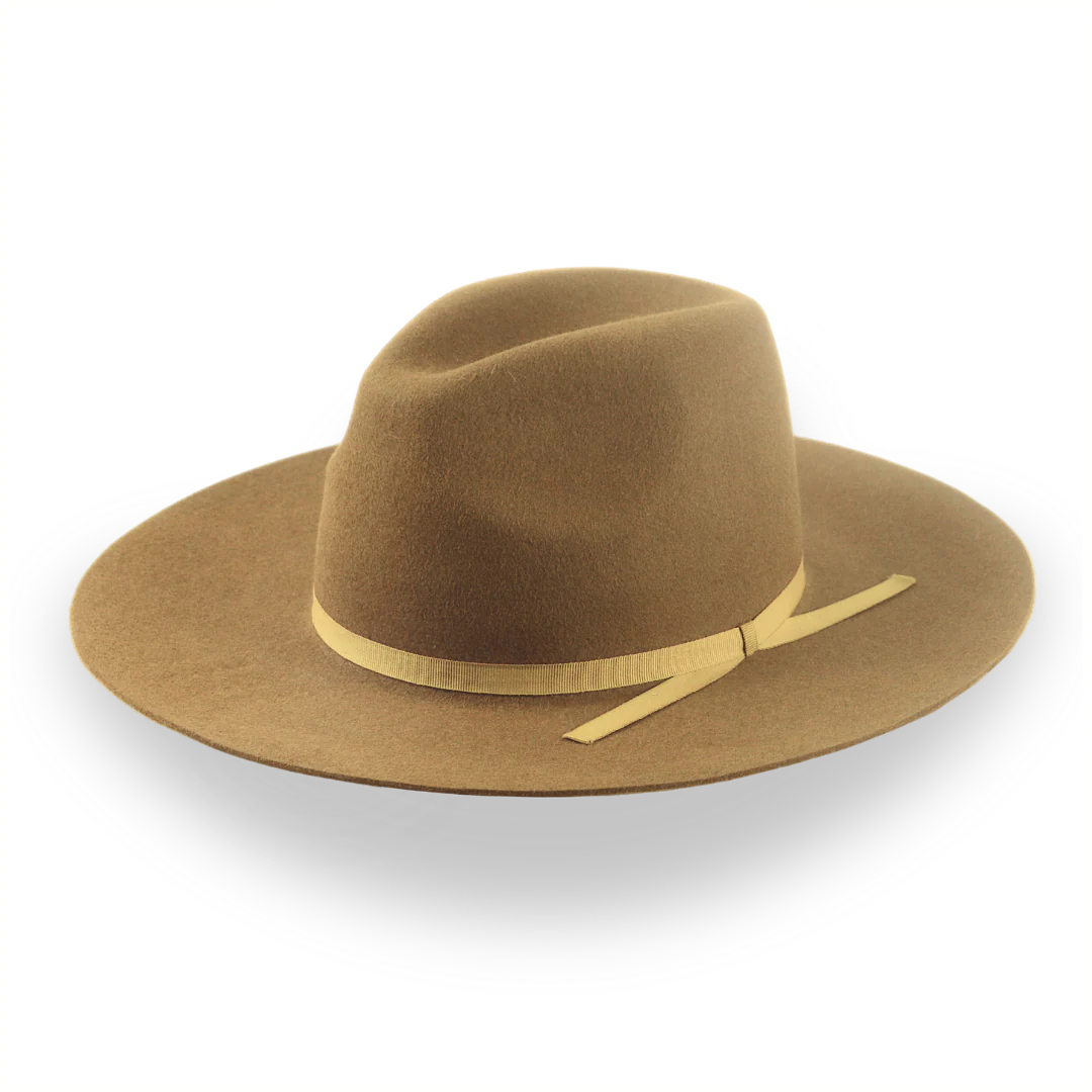The Longsword is a brown flat bill Western fedora handcrafted from premium rabbit fur felt, featuring a wide flat brim and center-dent crown. Custom-made for a perfect fit, this hat offers rugged style with practical sun protection.