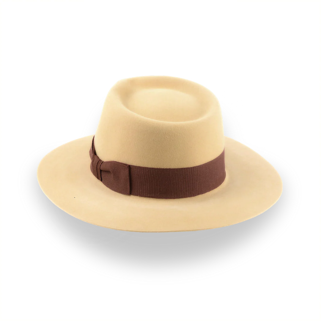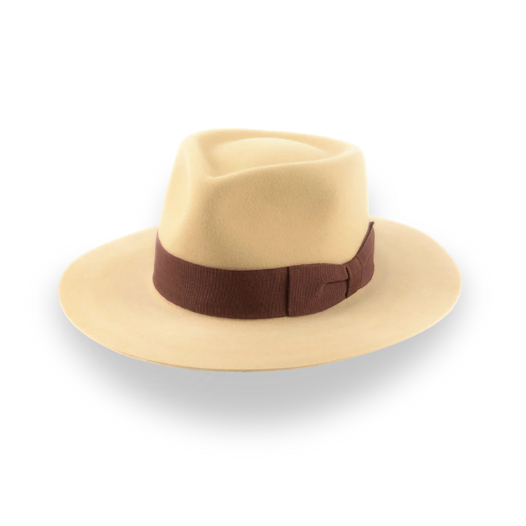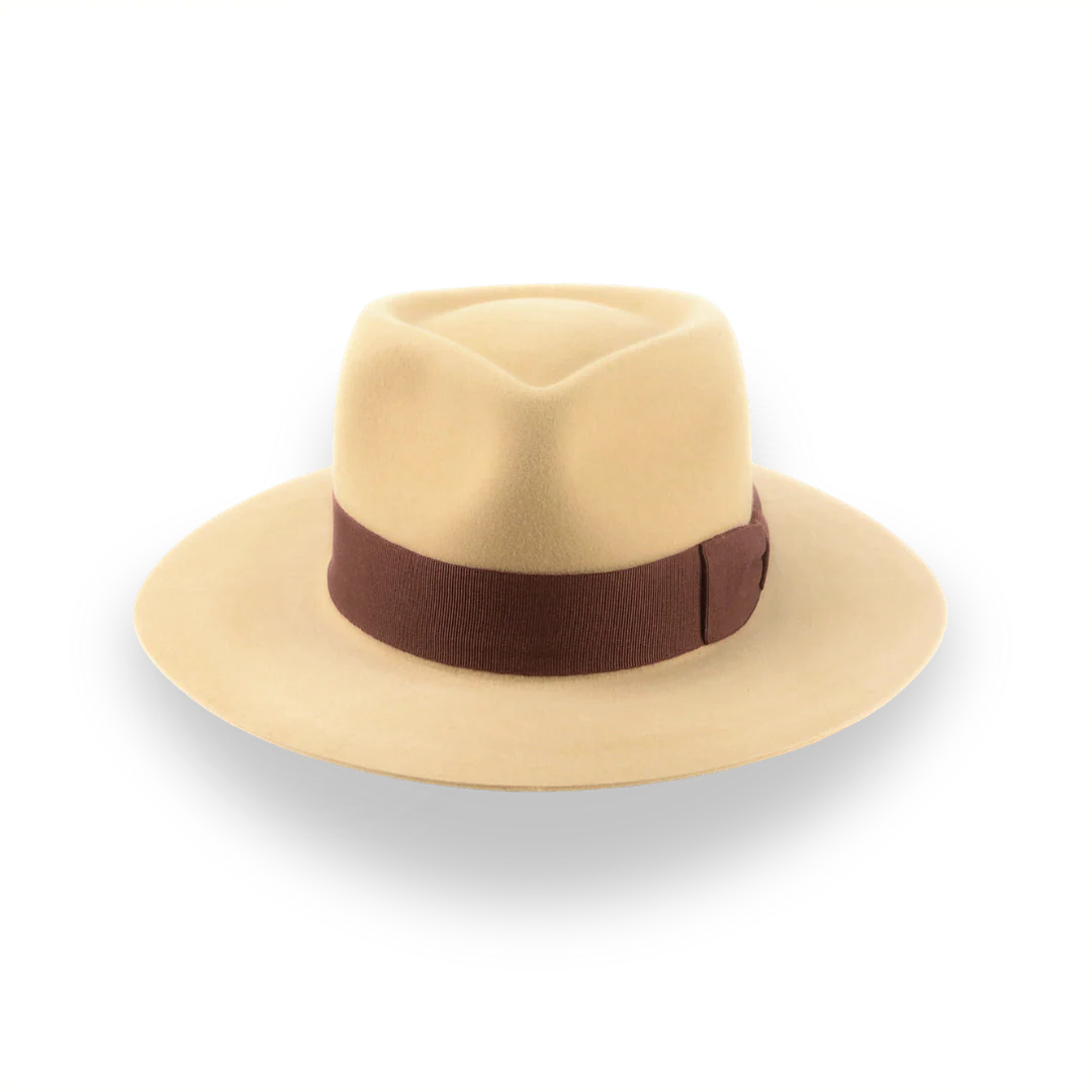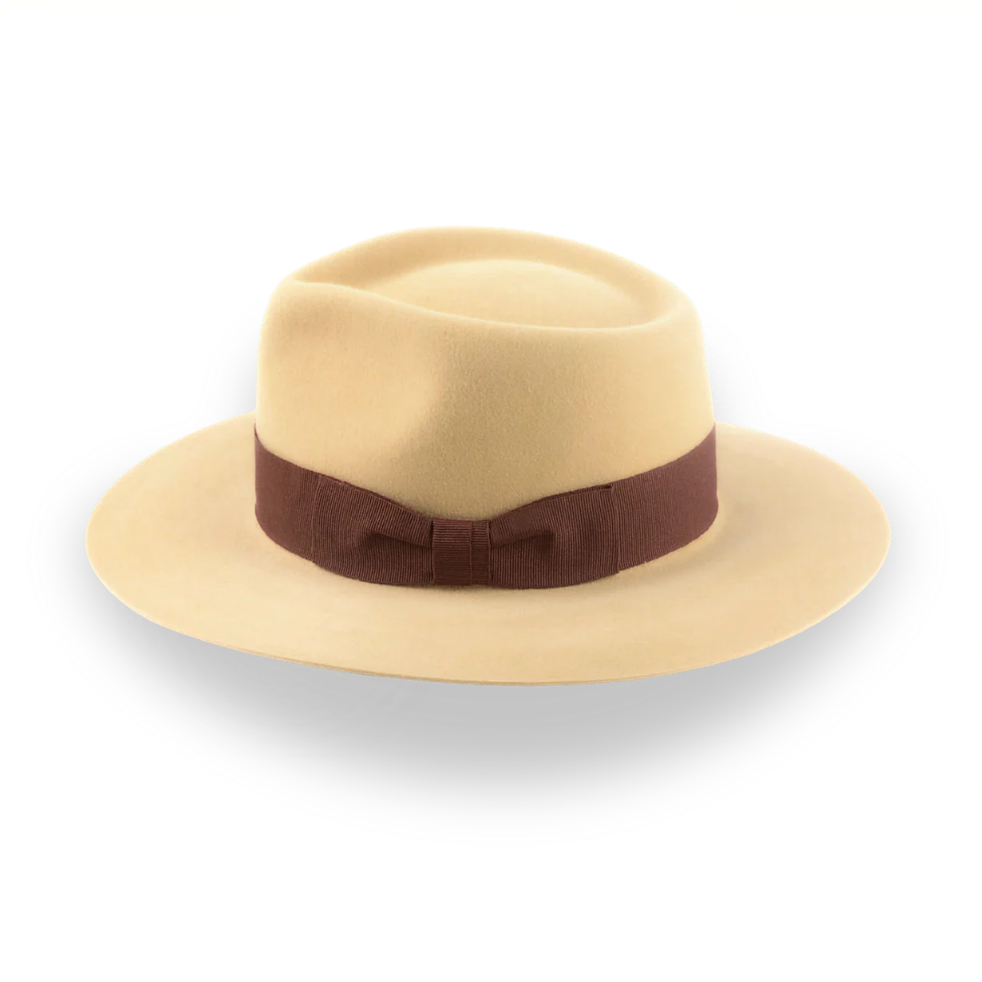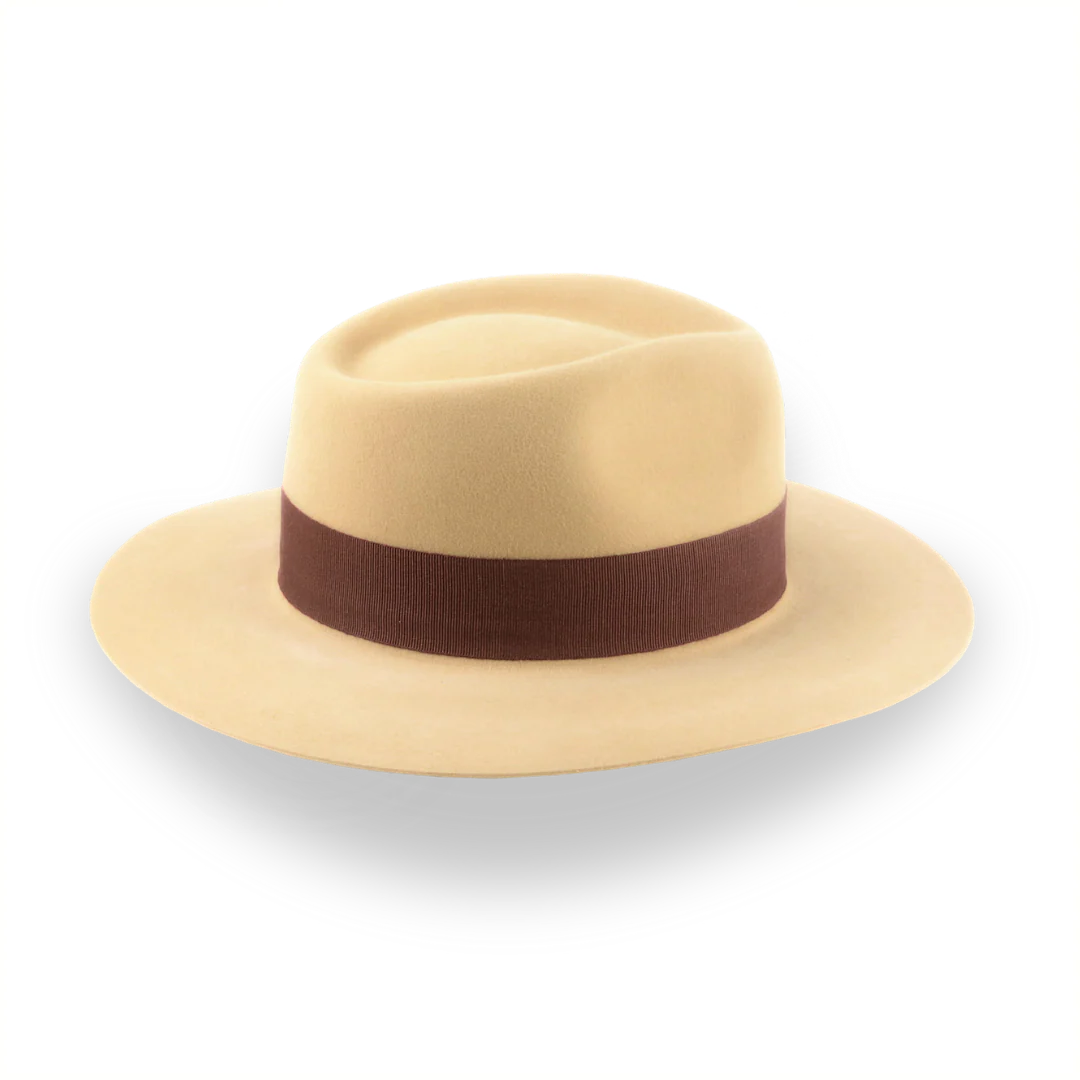 The Rusty, a biscuit yellow wide brim fedora made from luxurious rabbit fur felt, offers a striking silhouette with a teardrop crown and 3" brim. Custom-made for a perfect fit, this hat combines chic style and practicality.